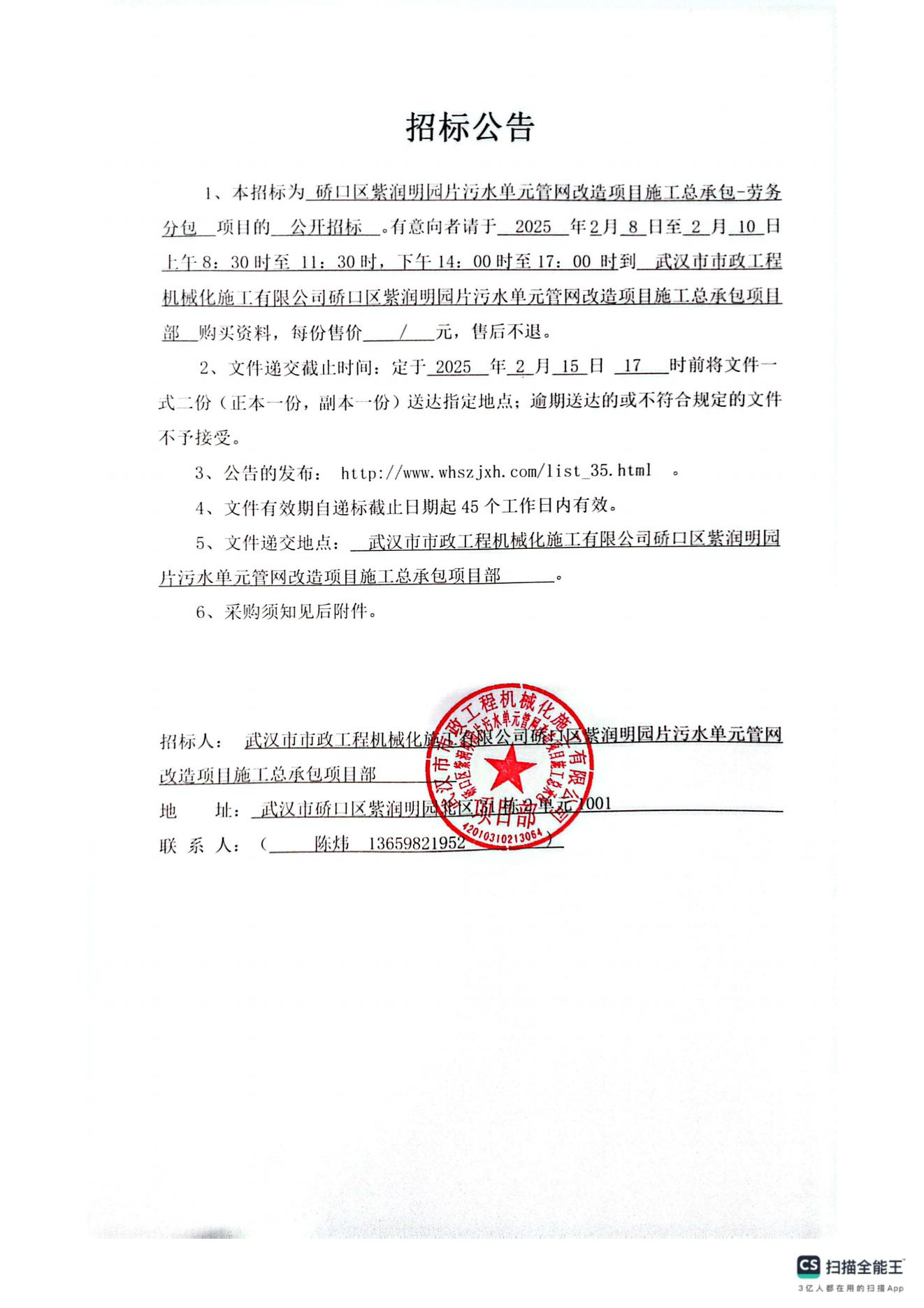 硚口區(qū)紫潤明園片污水單元管網(wǎng)改造項(xiàng)目施工總承包-勞務(wù)分包招標(biāo)公告