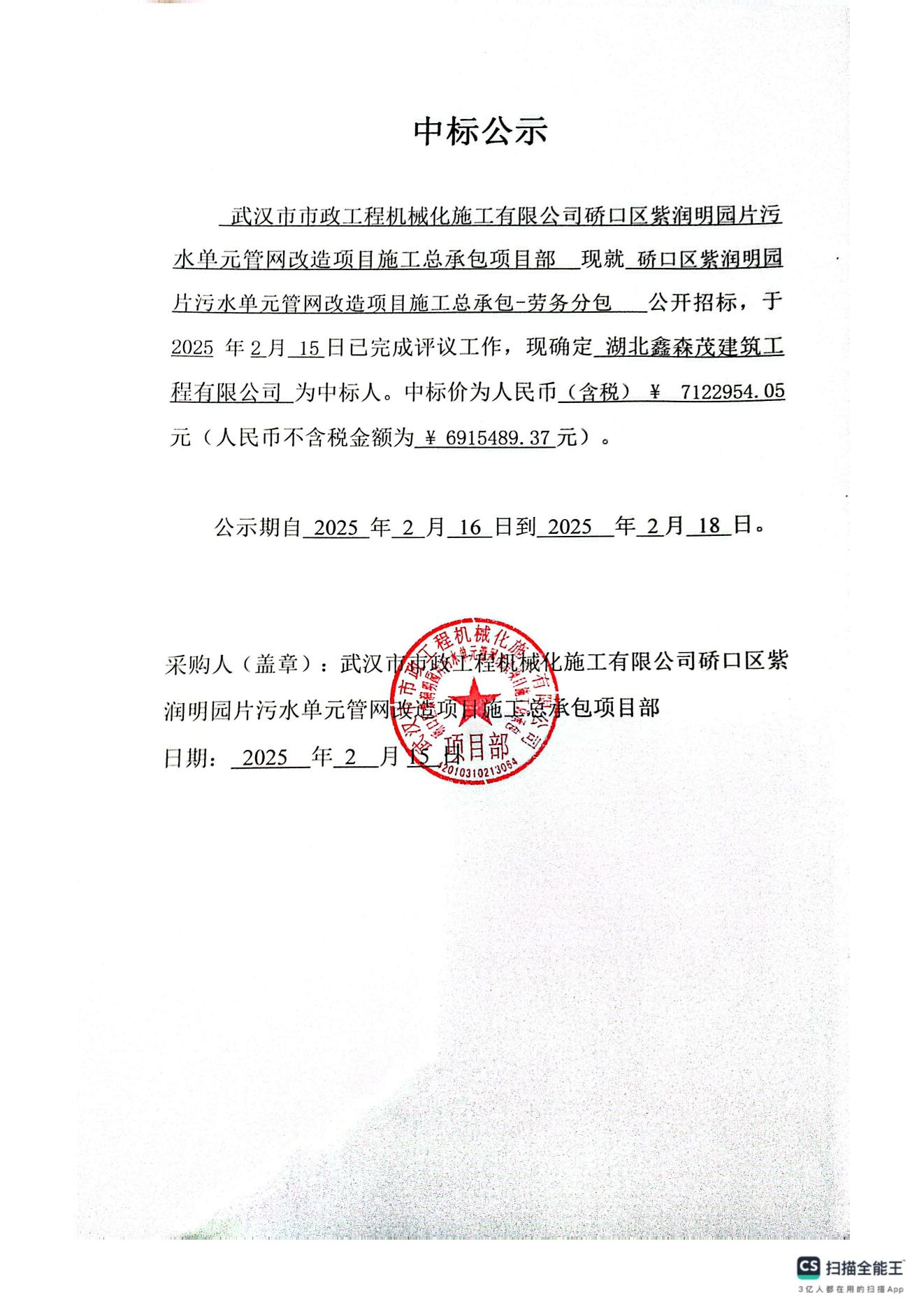 硚口區(qū)紫潤明園片污水單元管網(wǎng)改造項目施工總承包-勞務(wù)分包中標(biāo)公示