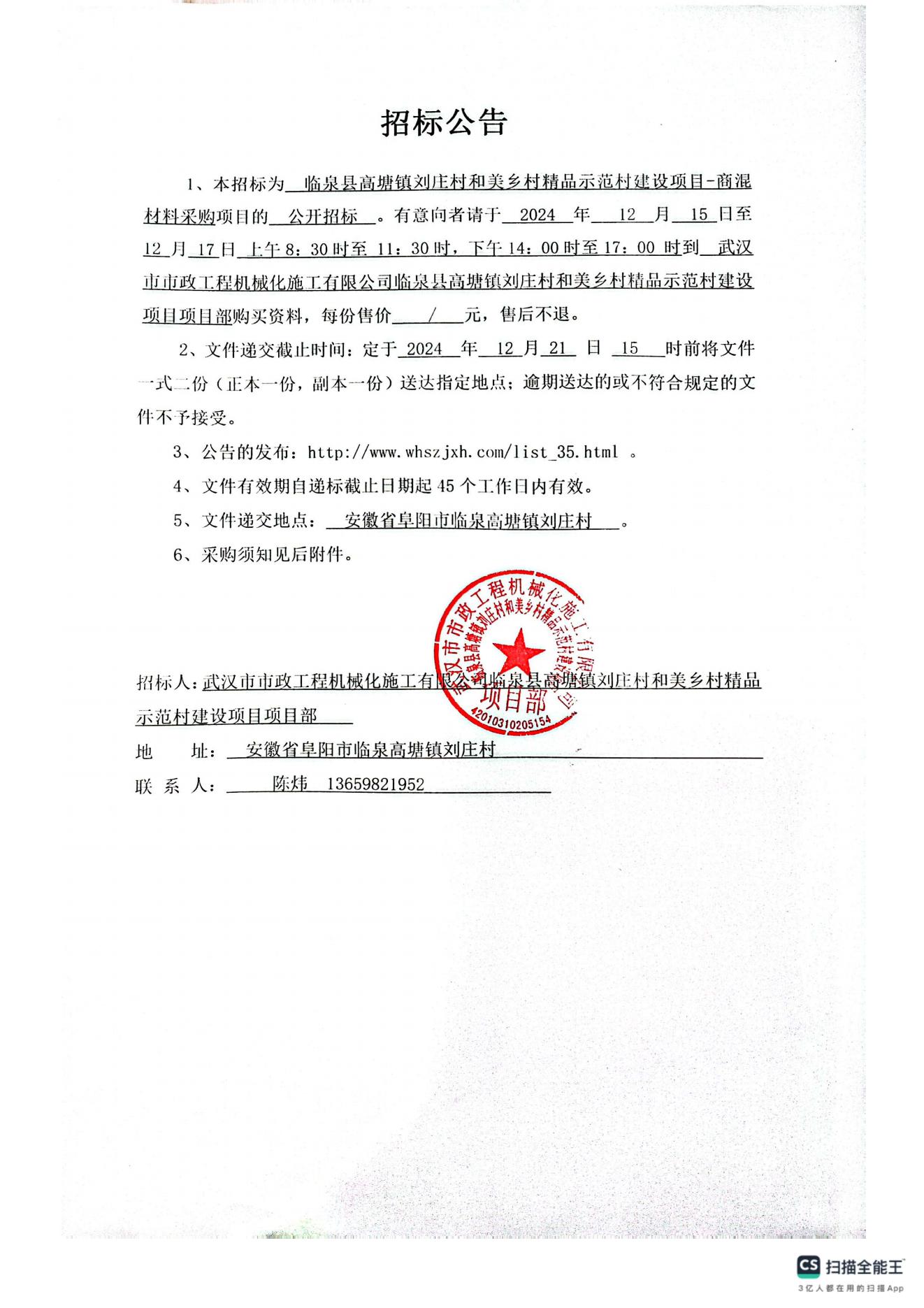 臨泉縣高塘鎮(zhèn)劉莊村和美鄉(xiāng)村精品示范村建設(shè)項目-商混材料采購招標公告
