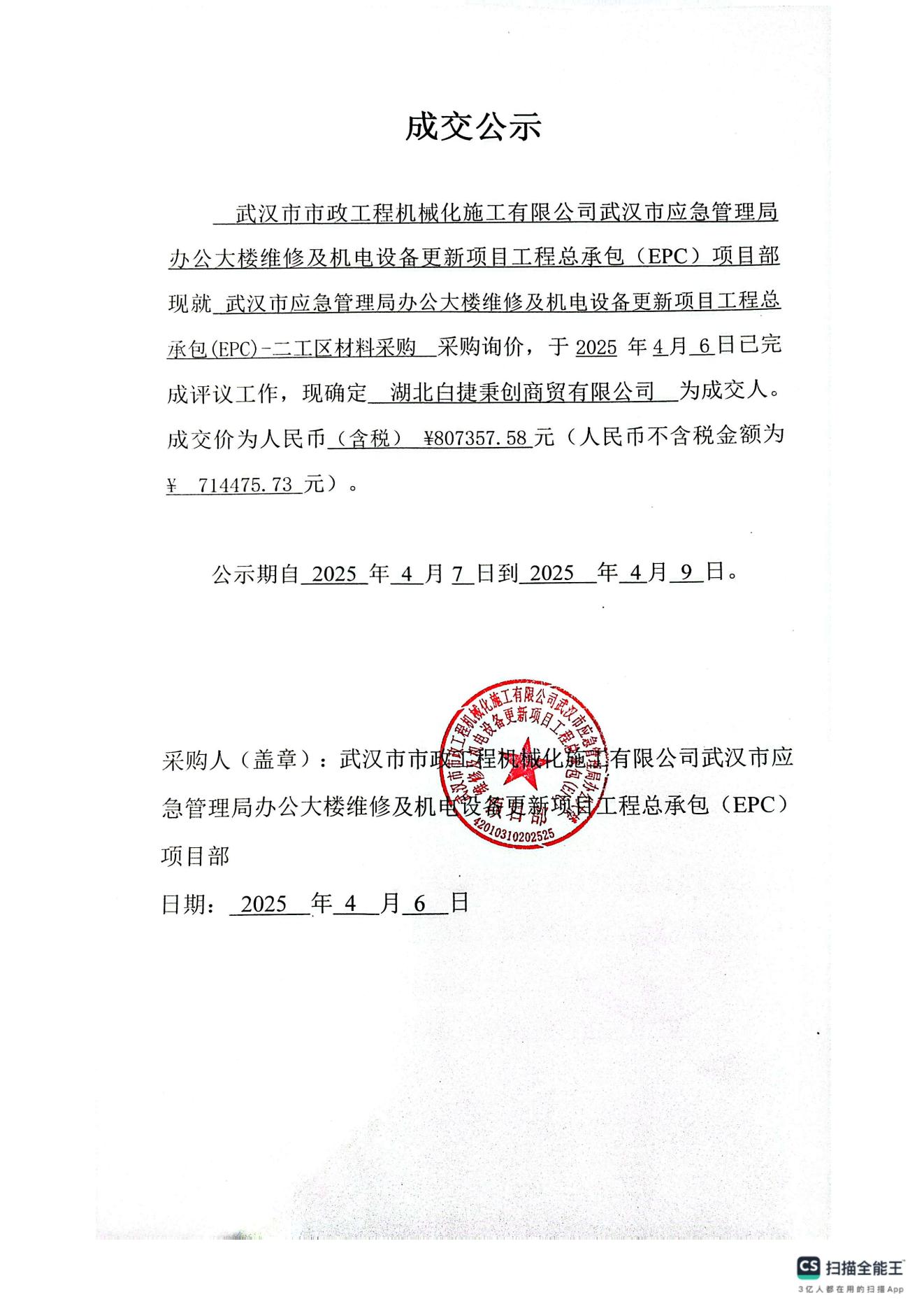 武漢市應急管理局辦公大樓維修及機電設備更新項目工程總承包(EPC)-二工區(qū)材料采購成交公示