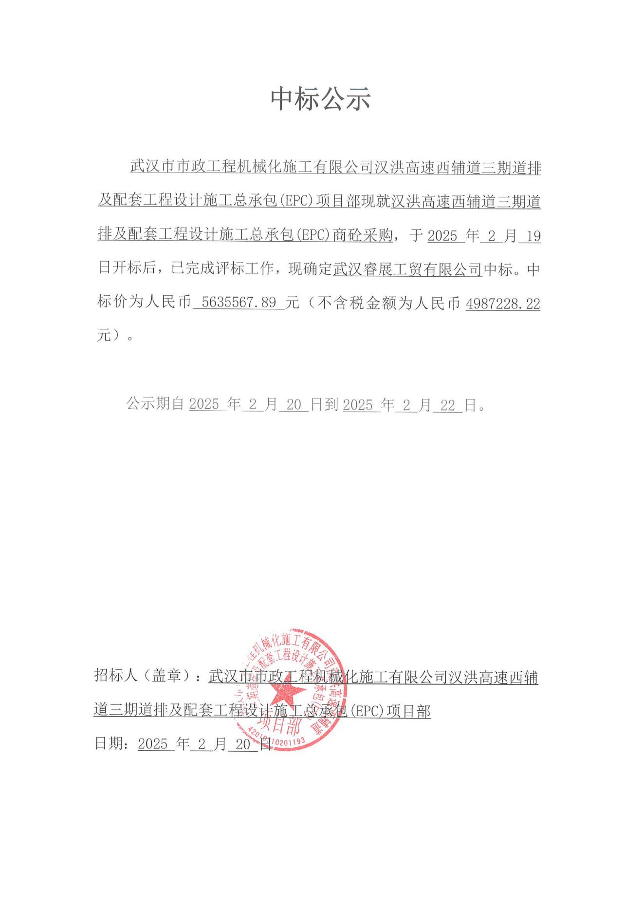 漢洪高速西輔道三期道排及配套工程設(shè)計(jì)施工總承包(EPC)商砼采購(gòu)中標(biāo)公示