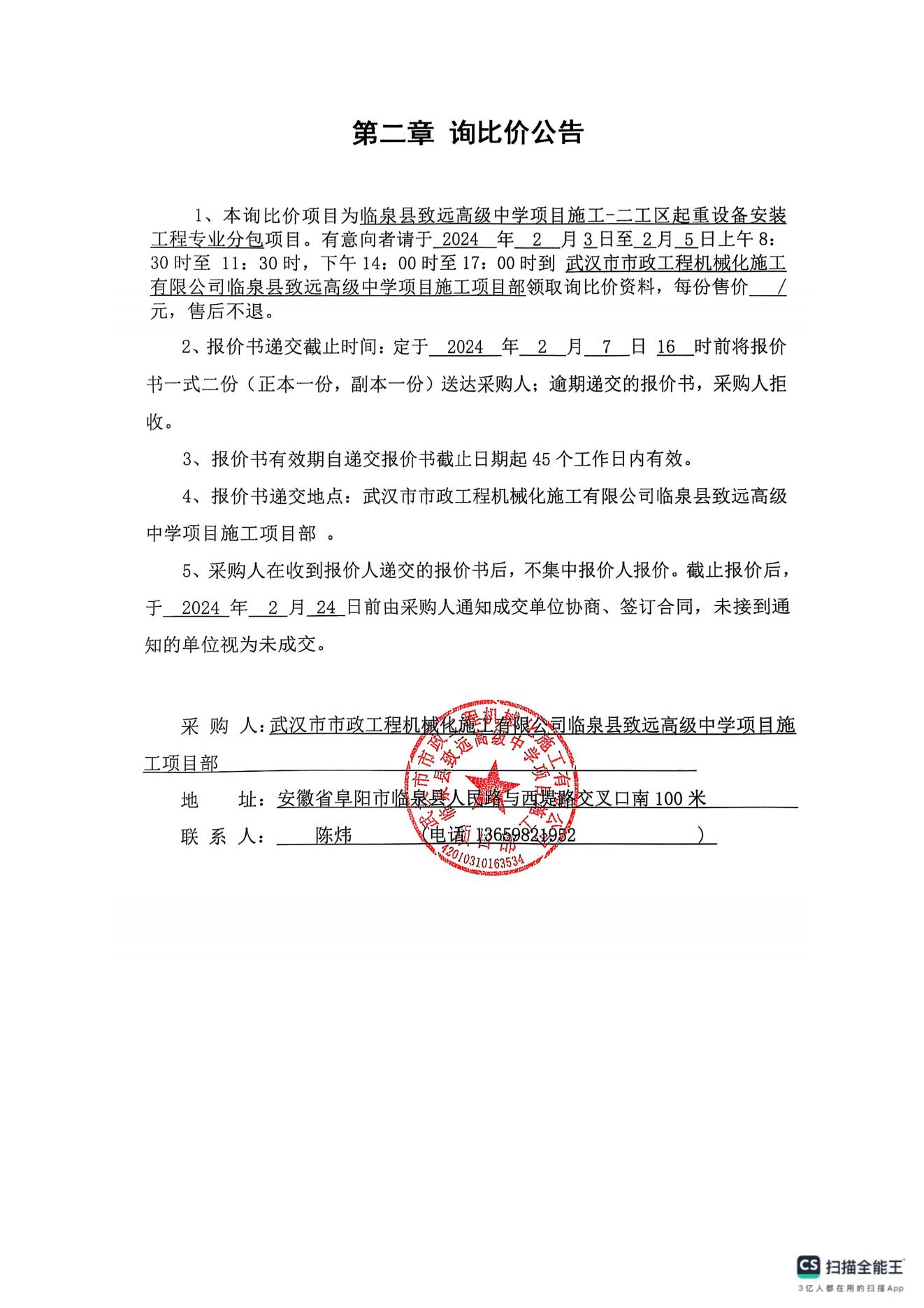 臨泉縣致遠高級中學項目施工-二工區(qū)起重設備安裝工程專業(yè)分包詢價公告