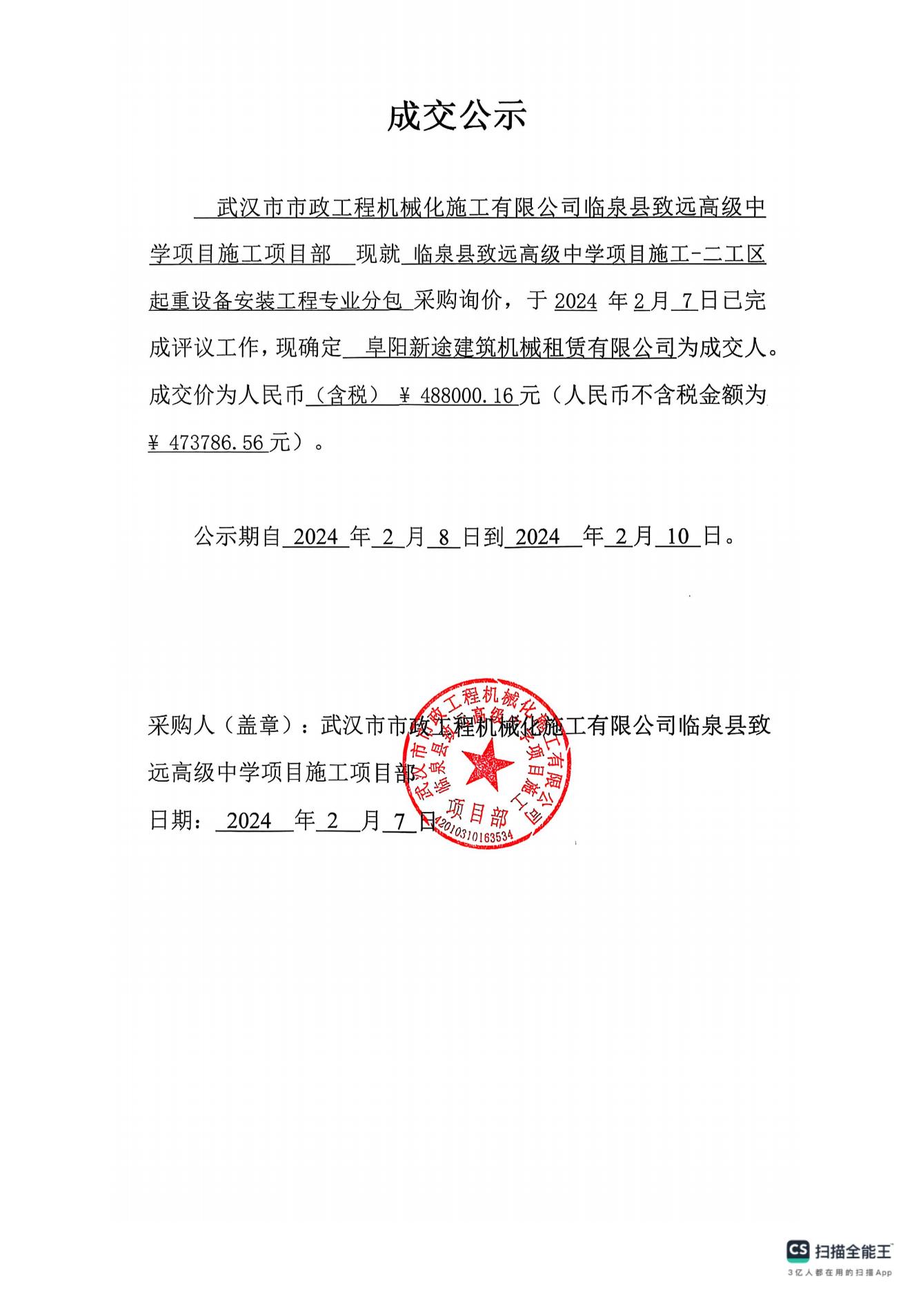 臨泉縣致遠高級中學項目施工-二工區(qū)起重設備安裝工程專業(yè)分包成交公示