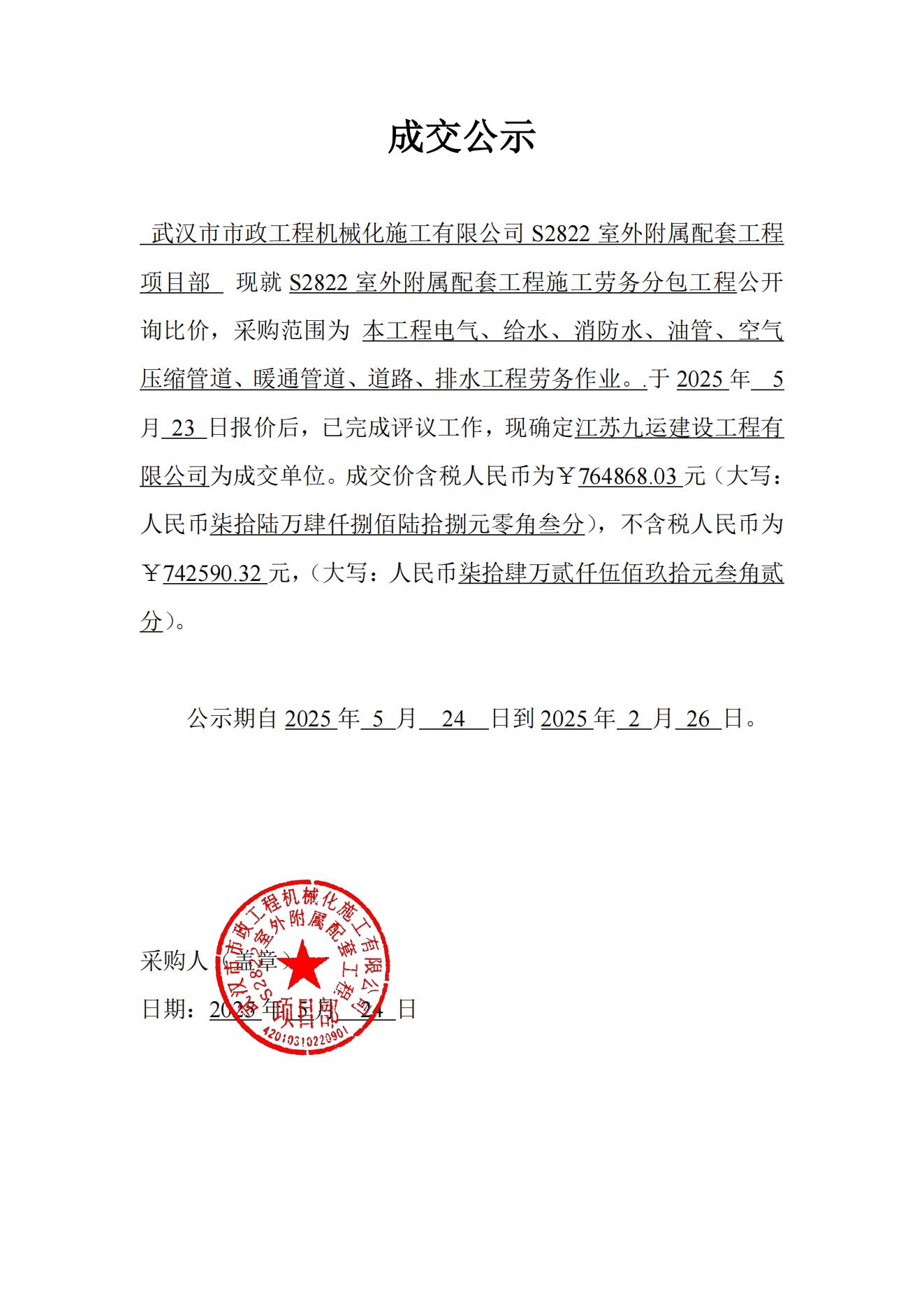 S2822室外附屬配套工程施工勞務分包工程成交公示