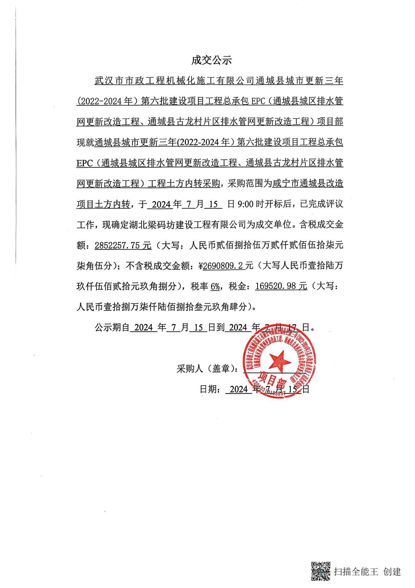 通城縣城市更新三年(2022-2024年)第六批建設(shè)項(xiàng)目工程總承包EPC(通城縣城北城中城南片區(qū)排水管網(wǎng)更新改造項(xiàng)目)土方內(nèi)轉(zhuǎn)工程成交公示